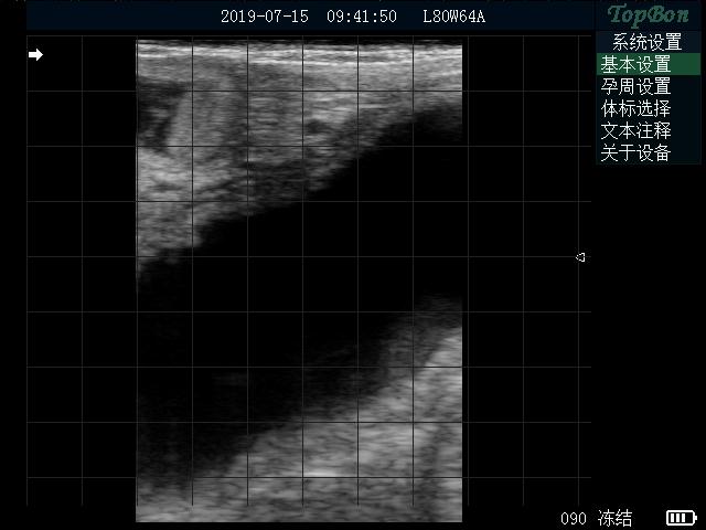 首先要給牛固定,最好有限位欄,防止被牛踩到。接下來給牛掏糞,因為牛的糞便會影響B(tài)超使用效果。第三步,手持B超探頭從牛的肛門伸入體內(nèi),伸入距離大概到手的肘部位置,用手按壓探頭,使B超聲窗和直腸緊密接觸,然后聲窗左右來回擺動,觀察到牛的子宮或者胎仔停止擺動,仔細(xì)觀察效果。不同時期胎仔的成像效果不同,這要結(jié)合牛的配種時間和臨床經(jīng)驗來判斷是否懷孕,下面是母牛懷孕3個月左右效果。拓邦B超不僅能清晰檢查懷孕情況,還能通過軟件測量,測量胎仔大概懷孕天數(shù)和預(yù)產(chǎn)日期,便于初學(xué)者學(xué)習(xí)使用。
